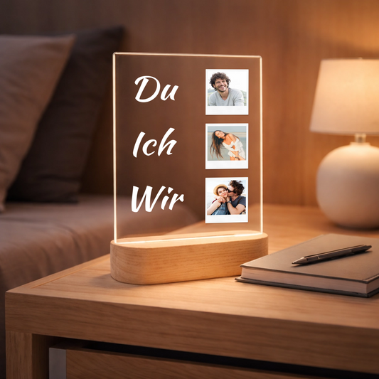 Personalisierbares Acryl-Licht mit LED Holzfuß "Du, Ich Wir"