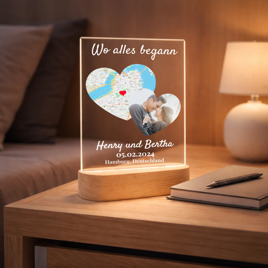 Personalisierbares Acryl-Licht mit LED Holzfuß "Wo alles begann"